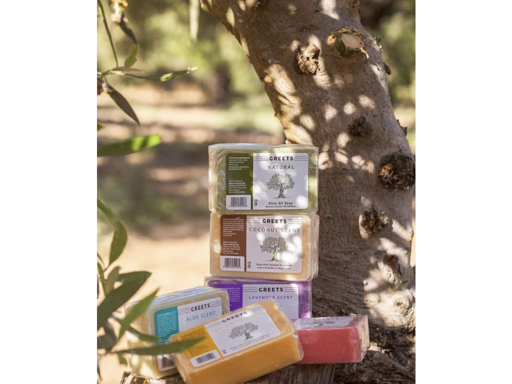 Mýdlo Greets z olivového oleje je součástí řeckého dědictví, protože ho používají po mnoho generací k osobní péči. Při každodenním používání zůstává pokožka jemná a hydratovaná. Základem tohoto květinového mýdla je organický olivový olej s vůní levandule.